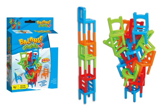 Popularna gra krzesła, przeznaczona dla dzieci od 4-go roku życia. Niewielki rozmiar opakowania sprawia, że grę można zabrać wszędzie ze sobą. Zestaw składa się z 24 krzesełek w 6 różnych kształtach i 4 kolorach (niebieskim, pomarańczowym, zielonym i czerwonym). Gra polega na układaniu wieży z krzesełek. Gracze ustawiają krzesełka po kolei jedno na drugim. Gracz, który spowoduje, zawalenie się wierzy, przegrywa. Gra uczy cierpliwości, zręczności i uwagi, pozytywnie wpływa na koordynację ręka-oko. |