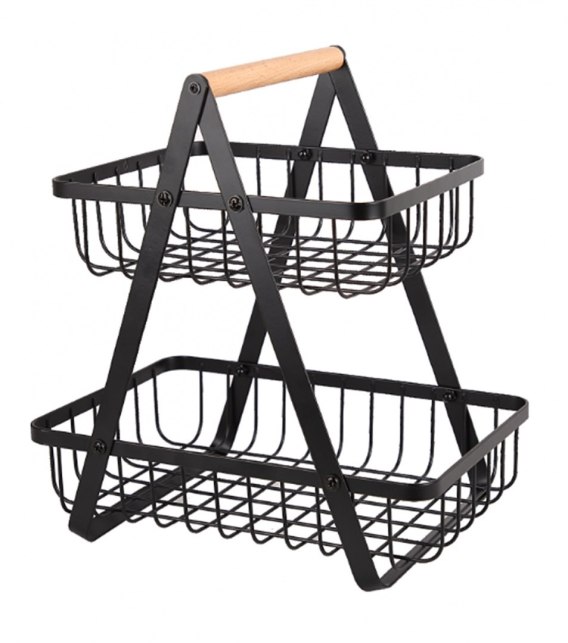 Koszyk piętrowy na owoce wykonany z prętów stalowych malowanych proszkowo. Może posłużyć do przechowywania owoców lub warzyw. Koszyk fantastycznie prezentuje się zarówno na kuchennym blacie jak i na eleganckim stole. Idealnie komponuje się z wnętrzami urządzonymi w stylu loft. Drewniana rączka do przenoszenia.