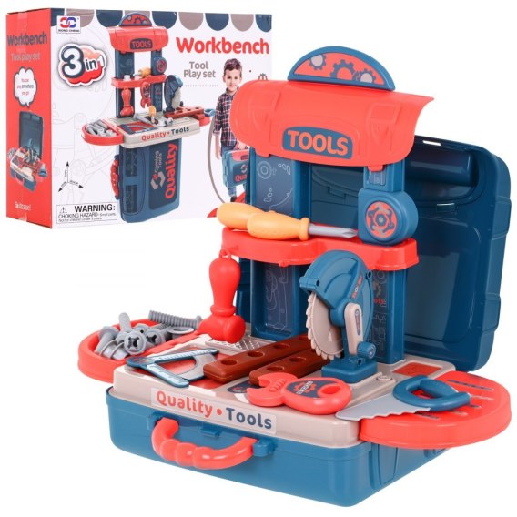 Zestaw narzędzi z walizką to zabawka dla dzieci powyżej 3 - go roku życia. Praktyczna walizka posiada wygodną rączkę do przenoszenia, jest za razem podstawą pod warsztat. Blat warsztatu można ułożyć na walizce położonej pionowo lub otwartej położonej na płasko. Warsztat posiada wszystko co niezbędne małemu mechanikowi. Wszystkie jego części składowe, po skończonej zabawie można włożyć do walizki i zabrać ją wszędzie ze sobą. |