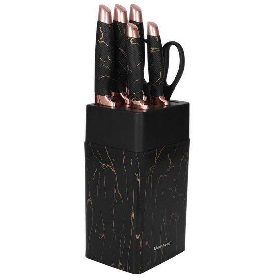 Zestaw 5 noży kuchennych w stojaku. W zestawie nożyce kuchenne. Stojak posiada wbudowaną ostrzałkę pozwalającą w razie potrzeby naostrzyć noże. Imitacja czarnego marmuru.