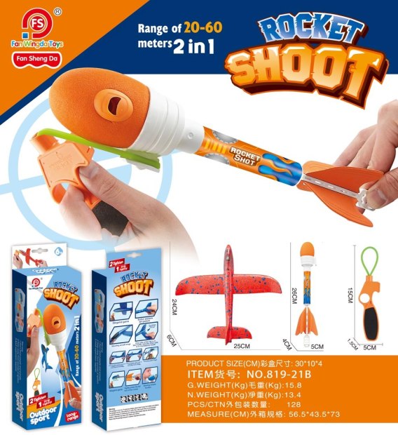 Idealny zestaw do zabawy na świeżym powietrzu, lekki, aerodynamicznie ukształtowany samolot, proca i rakieta dla dzieci od trzeciego roku życia. Samolocik wykonano z lekkiego styropianu, jest wytrzymały, a dzięki swej lekkości po wystrzeleniu może przelecieć 20 do 60 metrów. Rakieta posiada gumowe zakończenie, co zwiększa bezpieczeństwo jej używania. Do zestawu dołączona jest proca z gumką. Wystarczy zaczepić gumkę o element samolotu lub rakiety i wystrzelić je na dużą odległość. Wspaniała zabawa gwarantowana. Zestaw nie posiada ostrych krawędzi, jest łatwy w użyciu i bezpieczny dla dzieci. Rakieta zasilana jest bateriami (w zestawie). Po uderzeniu w cel jej korpus rozświetla się kolorami. W górnej części rakiety jest też gwizdek.